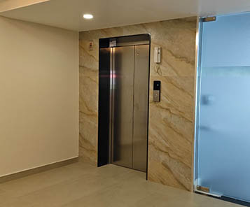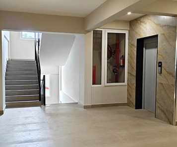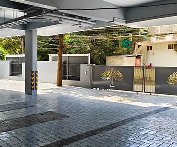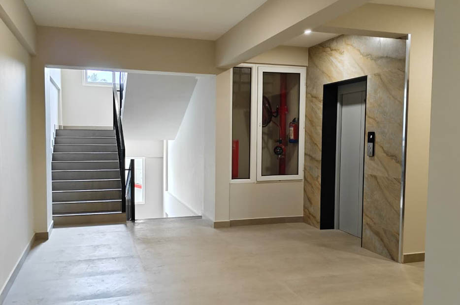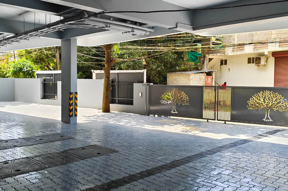 Firefighting arrangements as per Kerala Building Rules and Fire force requirement. Every floor provided with hose reel box and hose. Additional sprinklers provided in ground floor parking area.